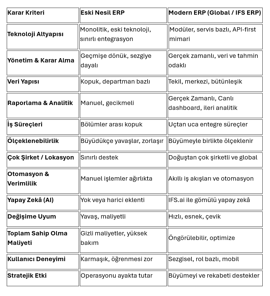 Bu yazıda; eski nesil ERP’ler ile modern global ERP’leri karşılaştırmalı olarak ele alacak, ardından modern ERP’lerin IFS ERP özelindeki yeteneklerini inceleyerek bu dönüşümün neden ertelenmemesi gerektiğini net şekilde ortaya koyacağız.